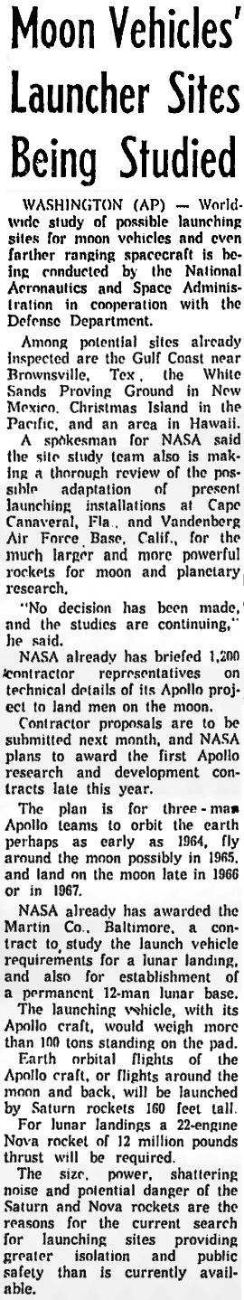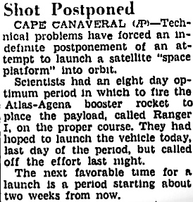— *Испытание космической платформы отложено (Space Platform Test Postponed) (на англ.) «The Washington Observer», 2.08.1961 в jpg - 108 кб