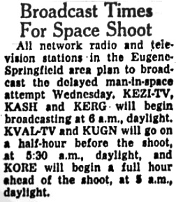 Все сетевые теле- и радиостанции в районе Ойген-Спринфилд планируют передавать в среду отложенную попытку отправки человека в космос. KEZI-TV, KASH и KERG начнут вещание в 6 утра по летнему времени. KVAL-TV и KUGN начнут работу за полчаса до запуска, в 5:30 утра, а KORE начнет за целый час до запуска - в 5 утра.