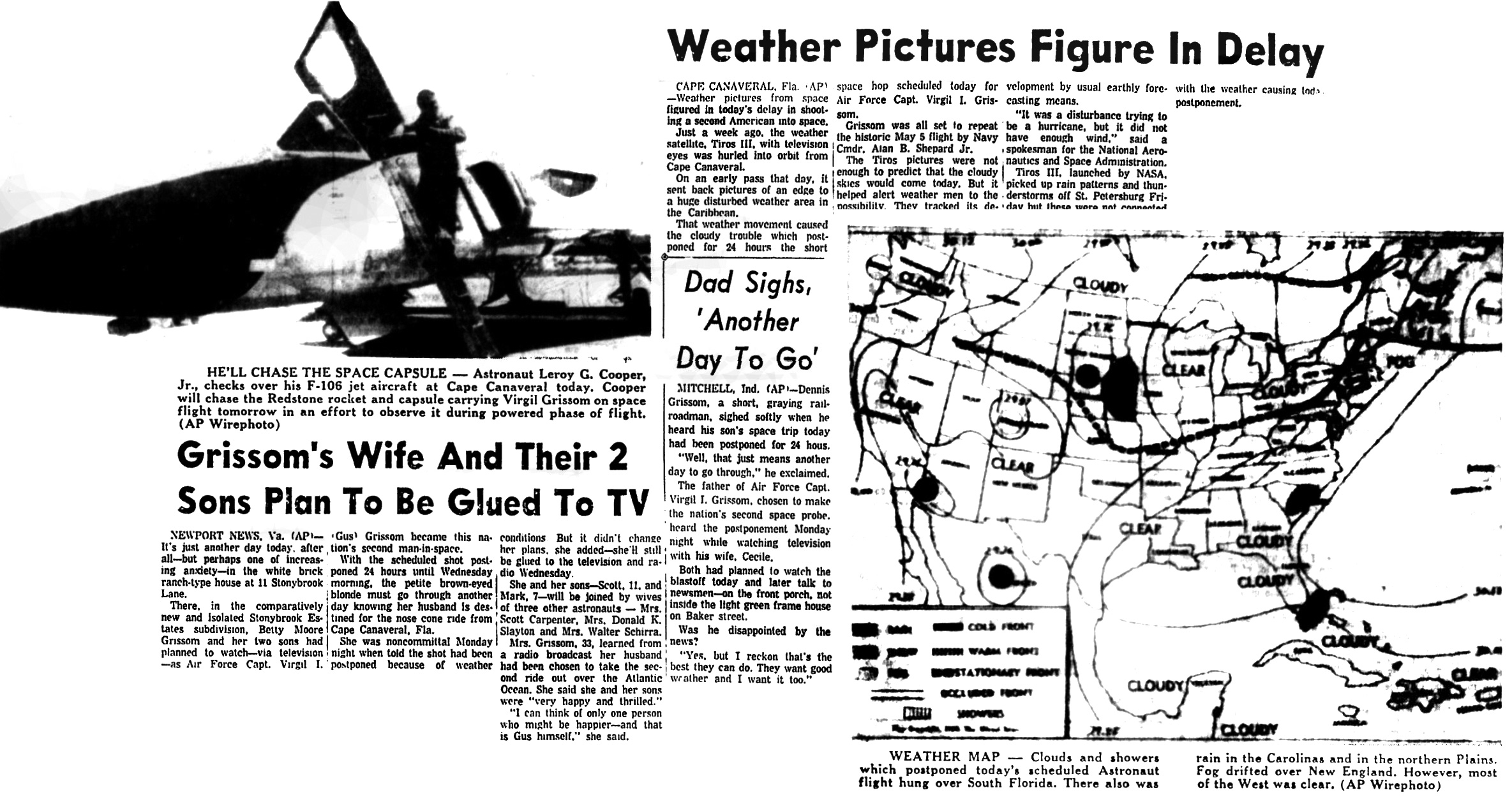 Мыс Канаверал, штат Флорида. Плохая погода вынудила Соединенные Штаты отложить на 24 часа — до утра среды — попытку запустить в космос астронавта Вирджила Гриссома.