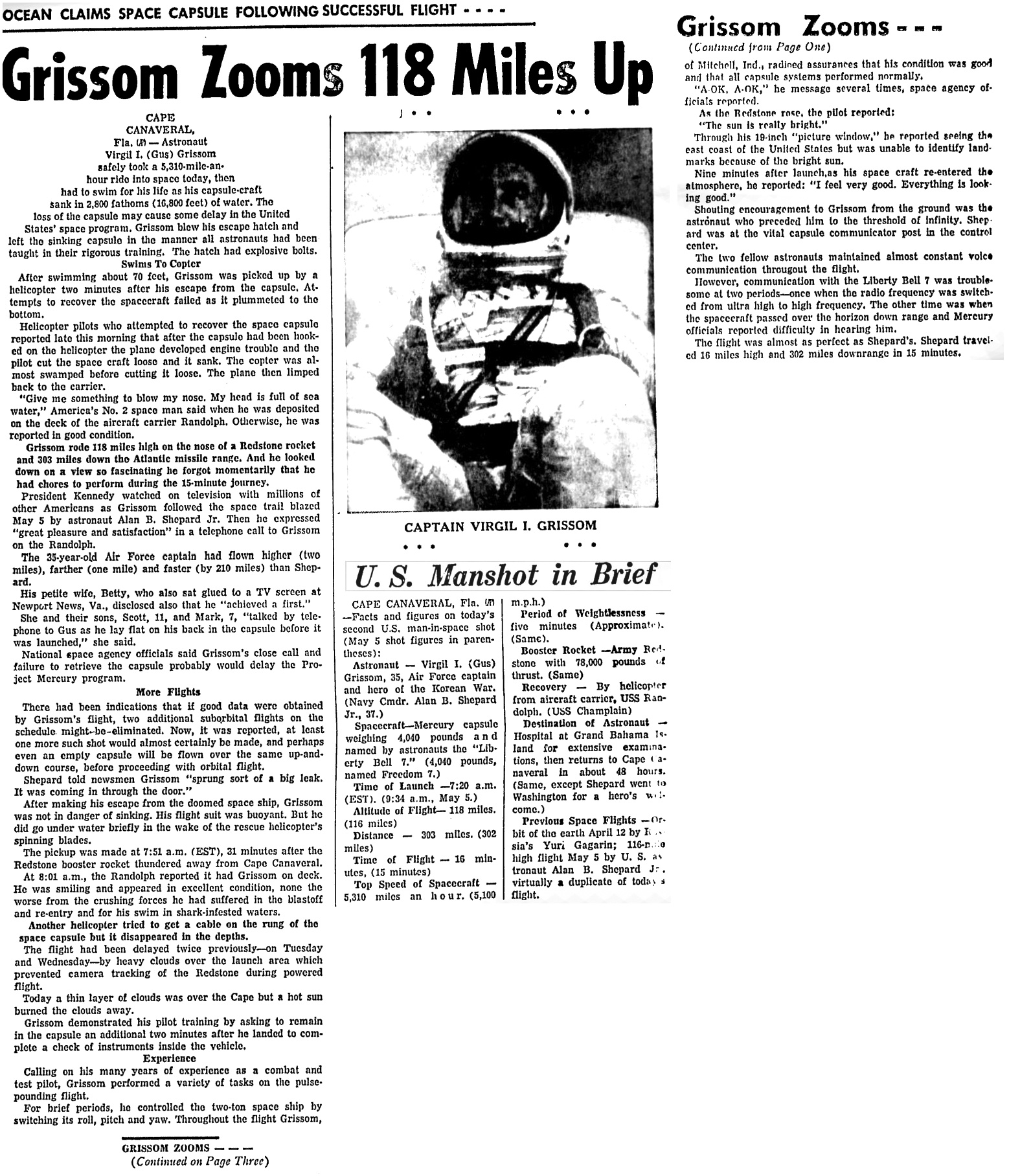 Мыс Канаверал, штат Флорида. Астронавт Вирджил Л. (так в тексте — П.) (Гас) Гриссом пережил сегодня полет в космос на скорости 5'280 миль в час, а затем совершил драматичный заплыв, спасая свою жизнь, когда капсула камнем ушла на дно Атлантического океана.
